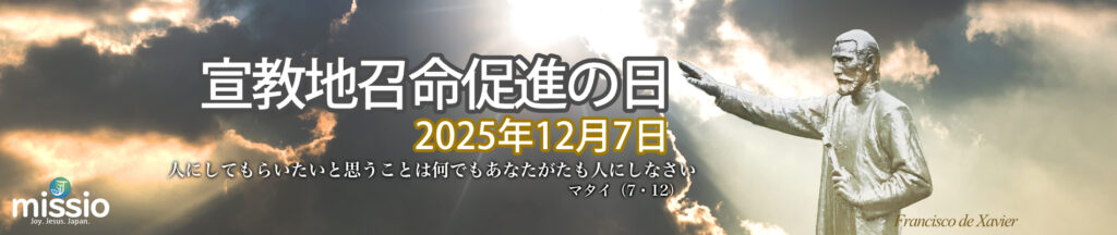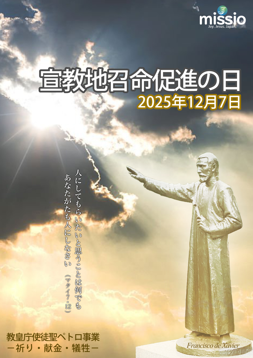 教皇庁使徒聖ペトロ事業より皆様に「宣教地召命促進の日」のポスターを送付させていただきます。2025年の「宣教地召命促進の日」は、12月7日(毎年12月の第1主日)です。一人でも多くの若者が司祭・修道者の召命に応え、キリストの後に従う喜びと「大きなあこがれ」をもつことができるよう願いながら、祈りと献金をささげましょう。